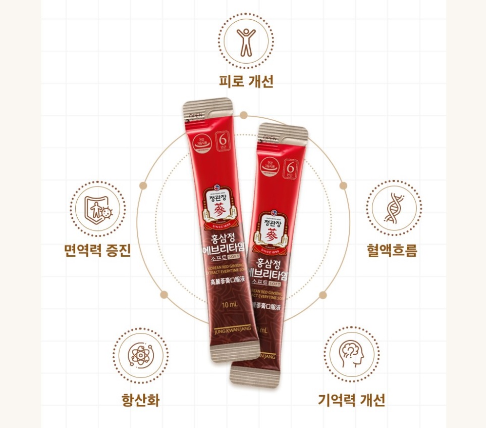 Sản phẩm thượng hạng của công ty hàng đầu tại Hàn Quốc KGC - Jung Kwan Jang 정관장, mang đến cho người dùng sức khỏe mong muốn và cải thiện tình trạng bệnh hiệu quả. Nguyên liệu làm từ hồng sâm 6 năm tuổi được lựa chọn kĩ theo tiểu chuẩn kiểm soát nghiêm ngặt của hãng sản xuất, bào chế dạng nước dễ dàng sử dụng với mọi nhu cầu người dùng